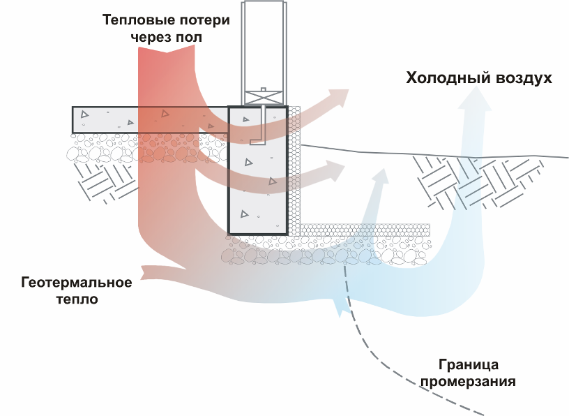 Схема тепловых потоков под фундаментом, фирма «Пеноплекс». Существуют отличия в устройстве утепления фундаментов для тех случаев, когда здание отапливается круглогодично, и когда оно остается холодным в зимний период. По идее, коттеджи отапливаются круглогодично, но есть ли в этом стопроцентная гарантия? Поэтому, в ряде проектов, ради перестраховки, утепление фундаментов в проектах показано исходя из того, что здание в какое-то время может остаться холодным зимой. Если вы уверены, что такого не будет, то утепление можно упростить при привязке фундаментов.