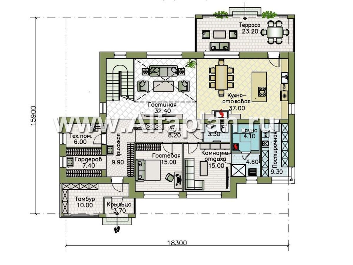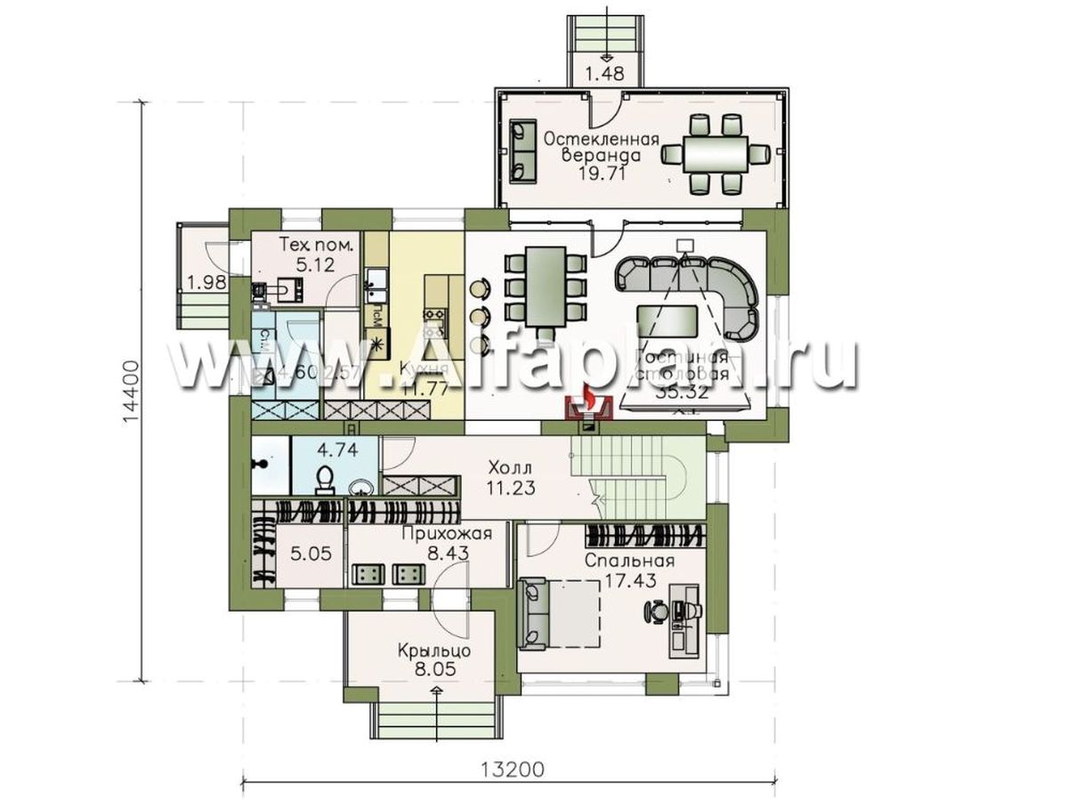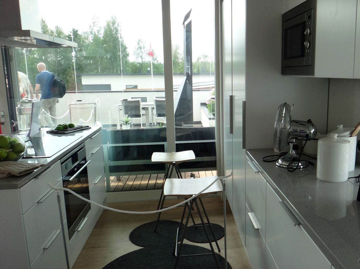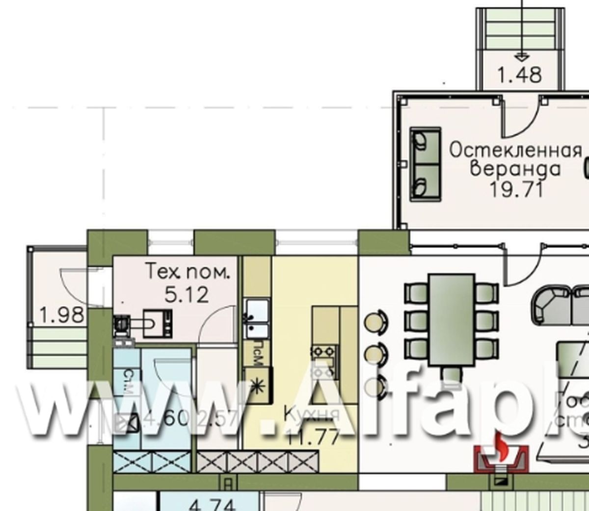 - Удобно, когда со стороны фасада дома к кухне примыкает терраса. Выход на террасу делается прямо из кухни, и в теплое время года можно «трепезничать» на террасе – не надо будет далеко носить еду и тарелки. Террасу в доме я всегда стараюсь пристроить со стороны кухни ради прямого выхода на нее.
