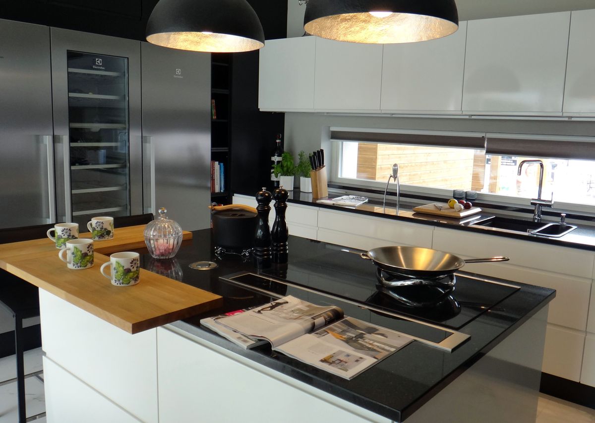 В загородных домах часто, по планировке, возможны островные решения кухонного пространства. При этом, на остров выносится варочная плита, под которой располагаются многочисленные ящики. Это – очень удобная опция. Во-первых, чаще всего это значительно расширяет пространство кухни, и ее функционал. Это – эргономично. Остров приближен к обеденной зоне, и с него удобно готовые блюда подавать на стол. Во-вторых, при готовке на «острове» хозяйка стоит к столовой и гостиной не спиной, а лицом, и полноценно участвует в жизни дома. В-третьих, это более красивое по интерьеру решение, чем просто кухонный гарнитур вдоль стен.