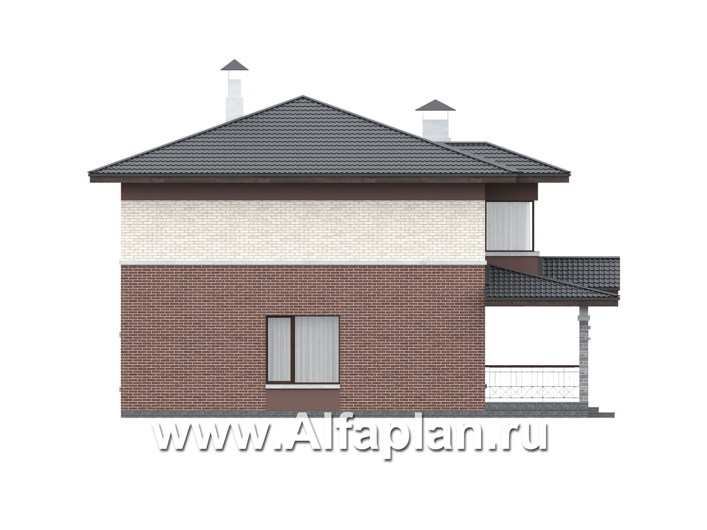 757A-2 «Невада» - проект двухэтажного дома из газобетона, с террасой со стороны входа, в стиле Райта, фасады из кирпичей