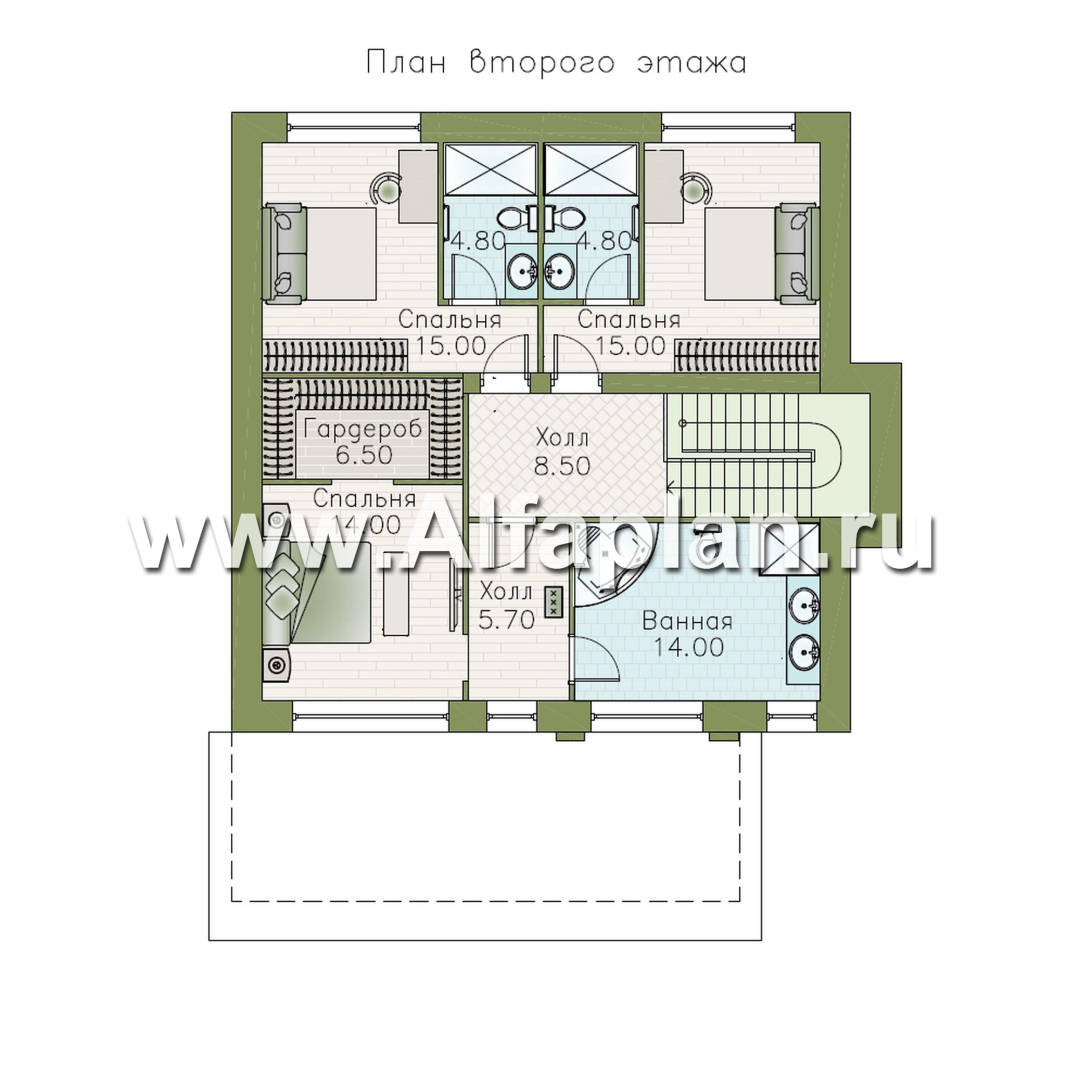 1130A «Багира» - проект дома 10х10м, планировка с террасой со стороны входа, все комнаты - мастер спальни, с сауной