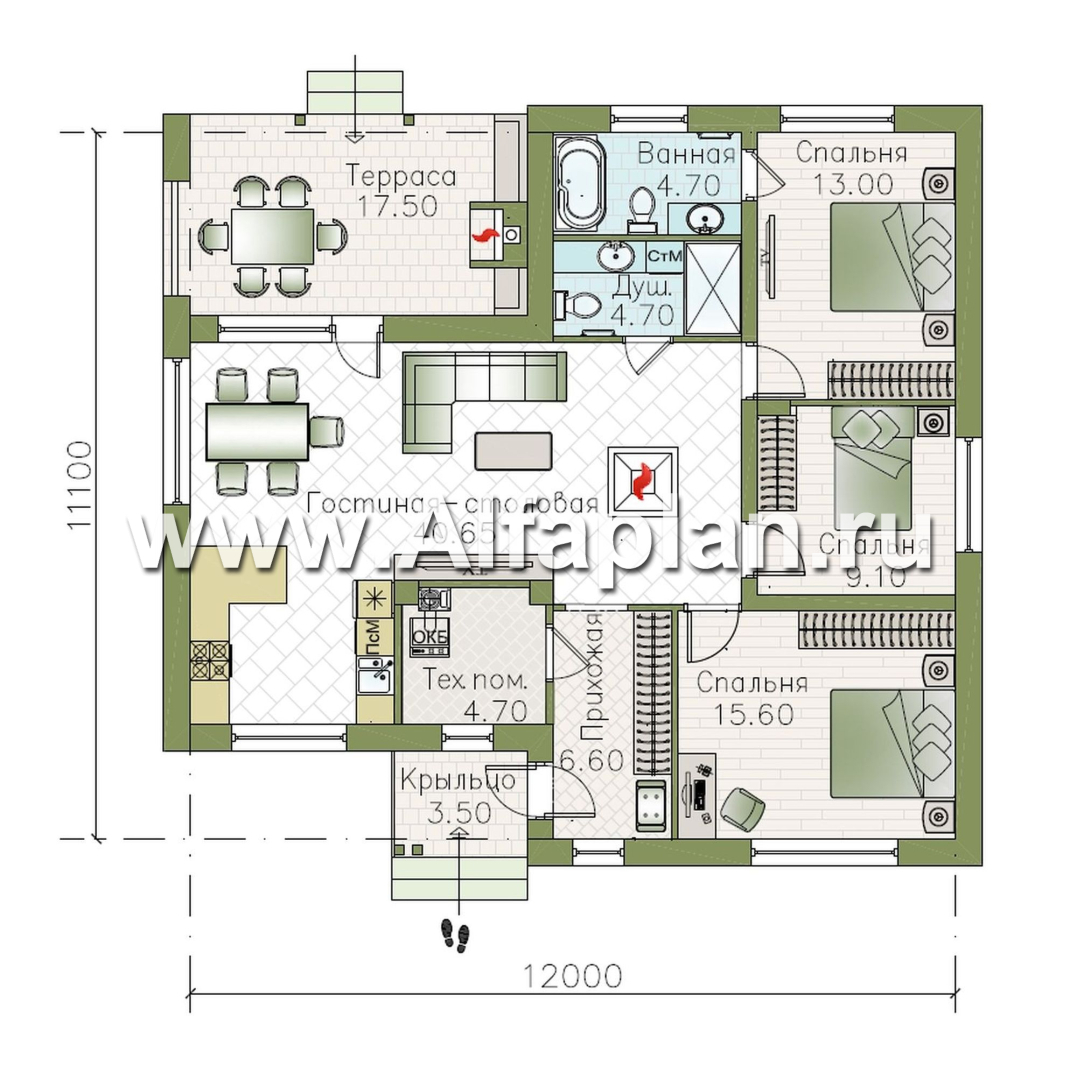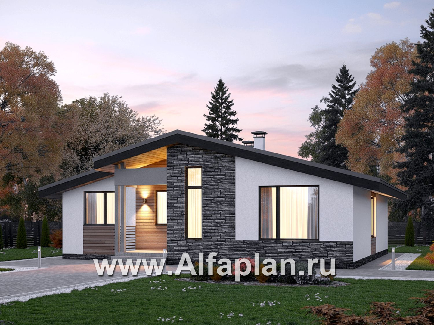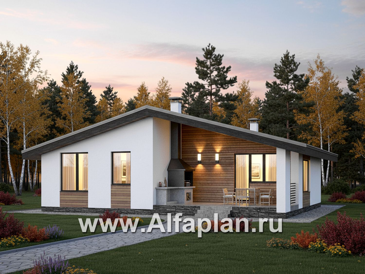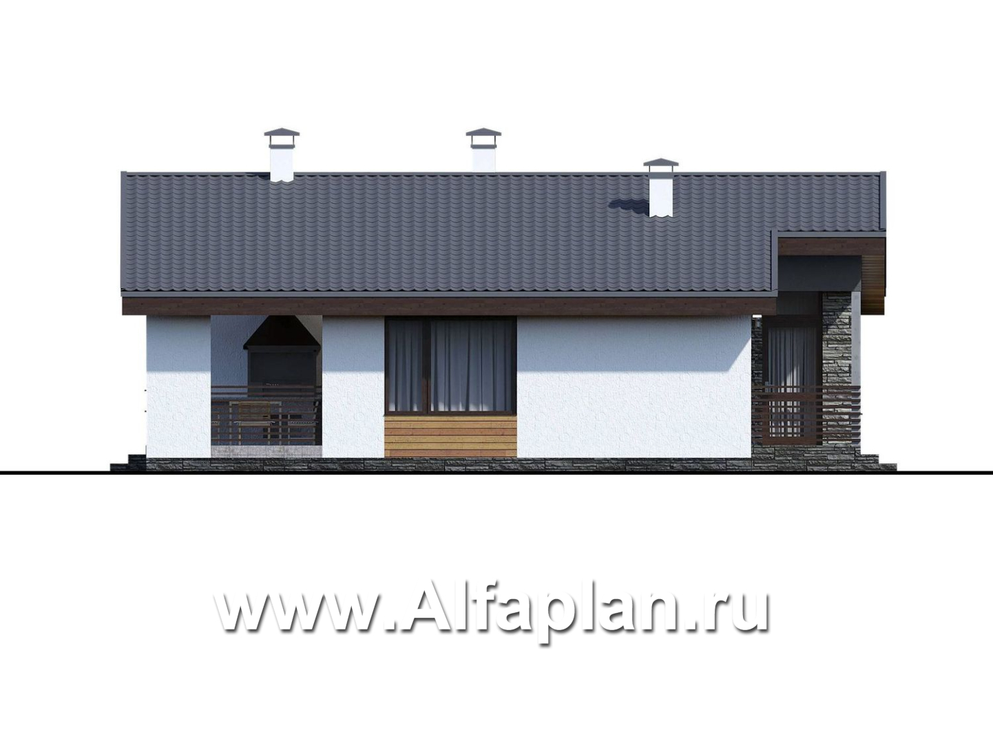 917A-2 «Калисто» - проект одноэтажного дома из газобетона, в скандинавском стиле, мастер спальня, с террасой и с островным камином