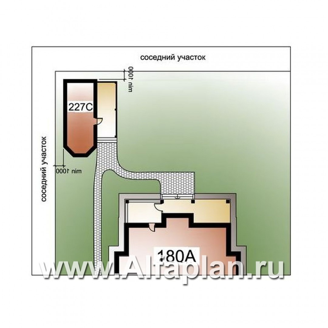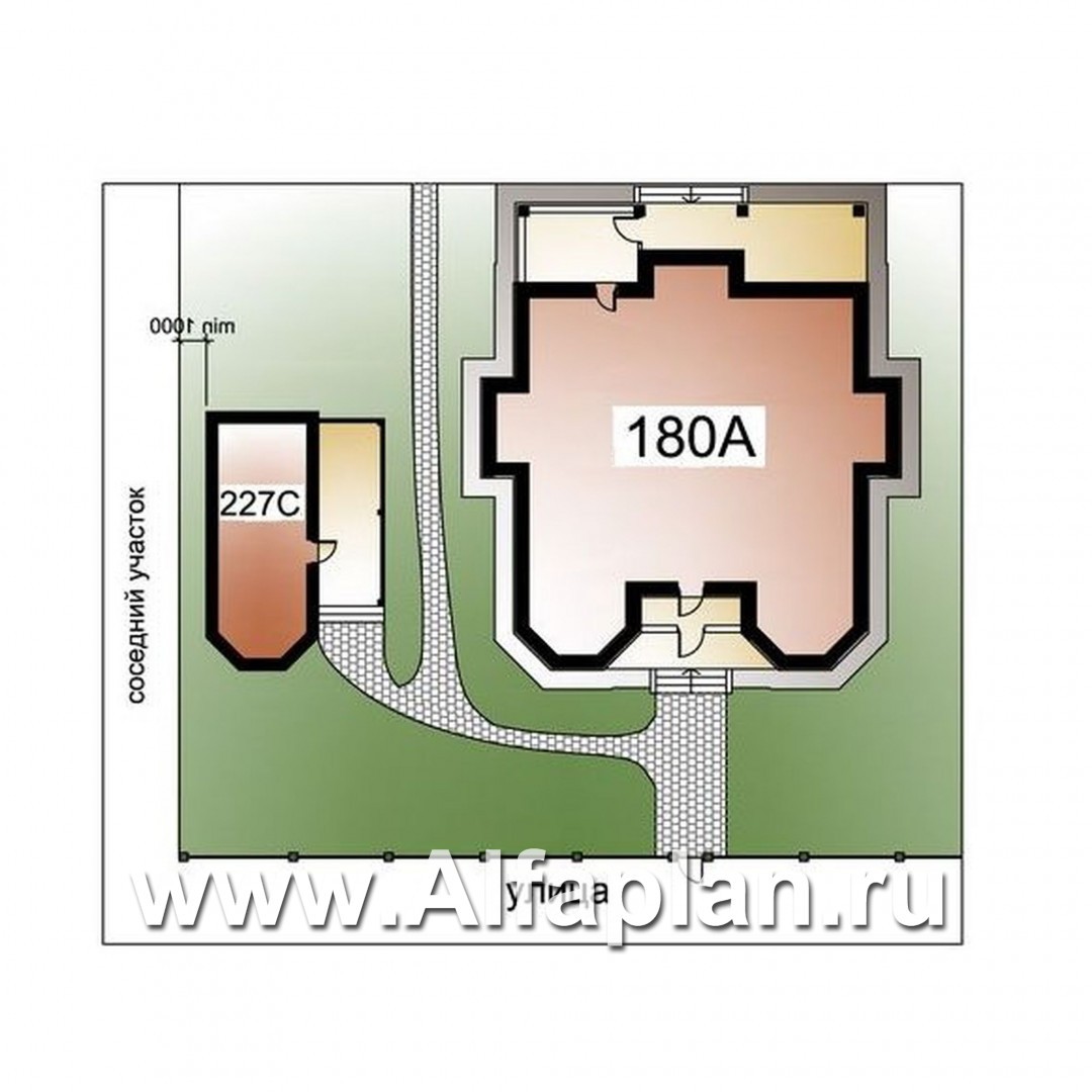 180A+227C-S «Рюрик»_ДУО - проект двухэтажного коттеджа в стиле замка + проект бани с эркером и с террасой
