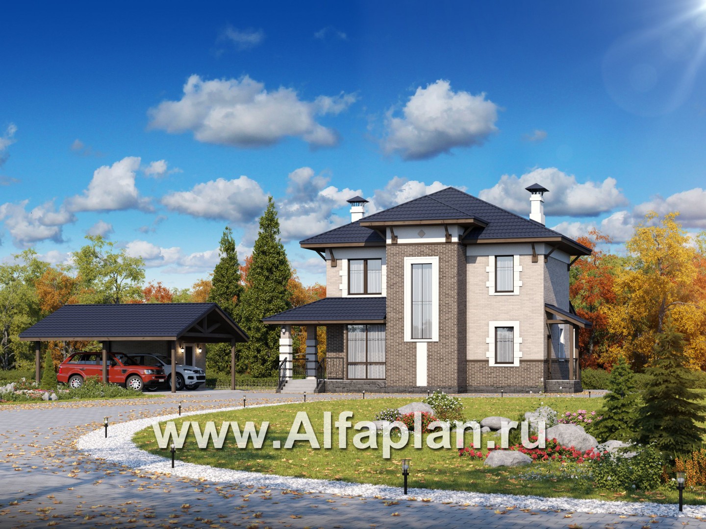 «Виконт»_ДУО - проект красивого дома + проект навеса на 2 авто с кладовой
