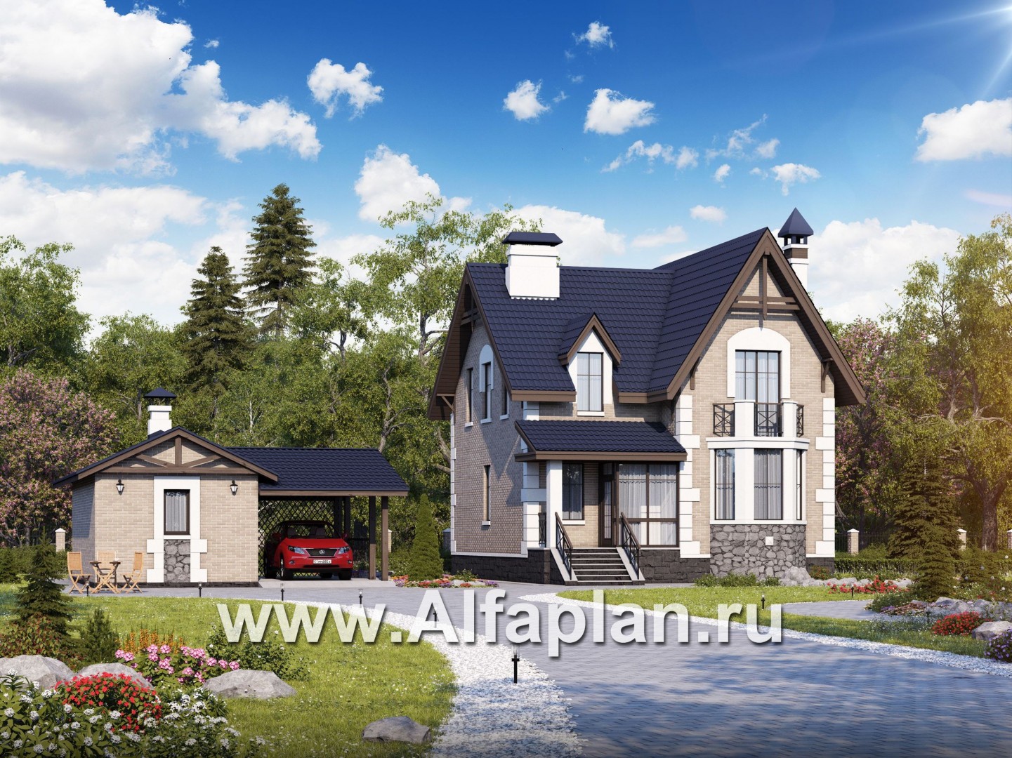 Ищете небольшой загородный домик для комфортного проживания в пригороде? Считайте, что вы его нашли! Проект загородного дома «Стелла Плюс» представляет собой коттедж в классическом европейском стиле с эркерами, высокими окнами и острой крышей. Общая площадь — 147 м2. Площадь гаража/бани — чуть менее 40 м2. Здесь предусмотрено целых два изящных балкона. Его парадный вход украшен небольшим крылечком. Вы также можете рассчитывать на: