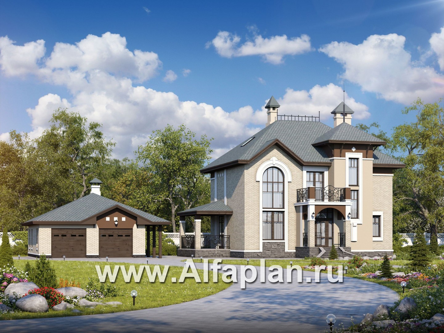 Двухуровневый коттедж, архитектура которого выполнена в романтическом характере с применением элементов стиля модерн. Дом очень напоминает замок, а отделка наружных стен искусственным камнем придает этому жилищу еще большую экстравагантность и историческое сходство. Большой полукруглый эркер глвного фасада здания, напоминающий башню, придает экстерьеру дома еще большую средневековую загадочность. В фундаменте дома заложена монолитная ж/б плита, а наружные стены выполнены из газобетонных блоков, так что проект вписывается в категорию «газобетонные дома». Лестница на входе в дом имеет изящные деревянные перила. Также на крыльце этой лестницы установлена колонна, поддерживающая балкон второго этажа, перила которого выполнены из того же изящного, деревянного ограждения. Фасад чердачного помещения отделан тем же декоративным, искусственным камнем и деревянными брусьями